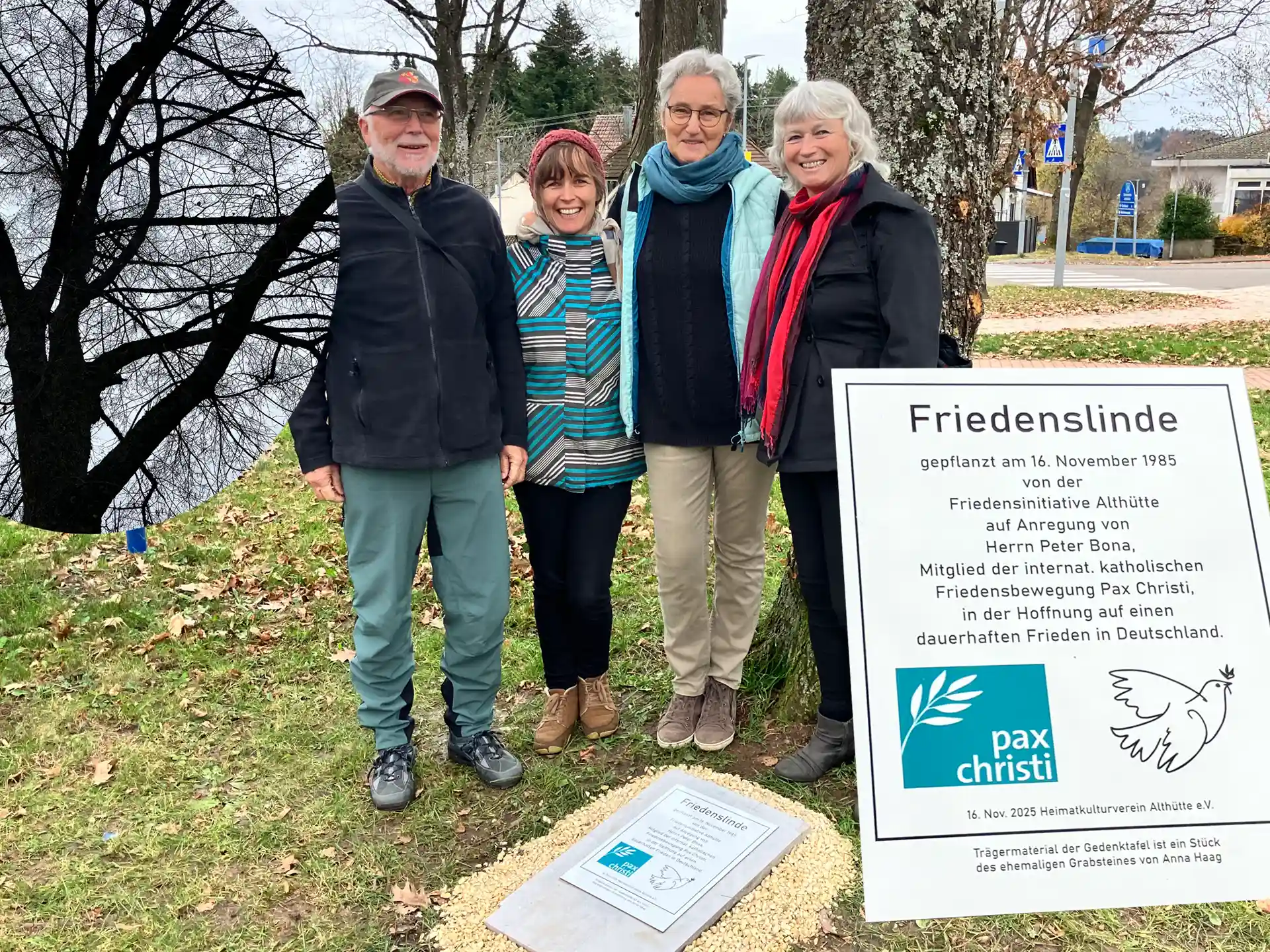 Doch wie so oft im Leben geriet dieses Symbol des beharrlichen Einsatzes für den Frieden in Vergessenheit. Eine Vergessenheit, die erschreckend parallel zu unserem kollektiven Gedächtnis für die kontinuierliche Arbeit steht, die Frieden erfordert. Die Reden zur Enthüllung der Gedenktafel am 16. November 2025, die diese vierzigjährige Linde nun ziert, schilderten Umstände, die den heutigen auf beängstigende Weise ähneln. Bürgermeister Reinhold Sczuka brachte es auf den Punkt: „Frieden fällt nicht vom Himmel – er wächst. Wie diese Linde. Und er braucht Menschen, die sich kümmern.“